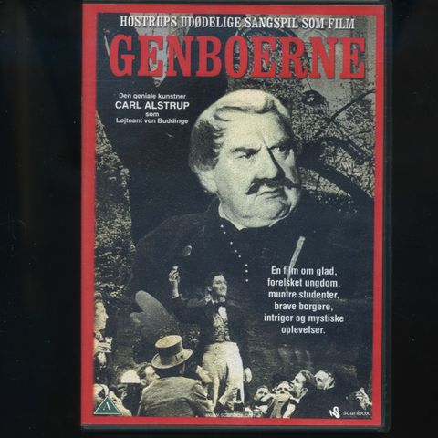 Genboerne dvd film. Dansk sort-hvid spillefilm i dvd-format. Forsiden viser Carl Alstrup i rollen som løjtnant von Buddinge. Bagsiden beskriver filmen som en film-sangleg efter C. Hostrup med instruktion af Flemming Lynge og Svend Rindom og med medvirkende blandt andre Arne Weel. Dvd’en er mærket som tilladt for alle.