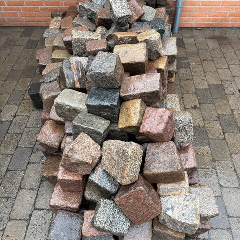 Brosten i granit i grå nuancer. Stenene er velegnede til belægning af indkørsel, gårdsplads, stier eller kantafgrænsning. Formen er typisk kubeformet, hvilket gør dem egnede til stabile og holdbare belægninger. Leveres løst som vist på billederne på paller der er ca 1200 stk.