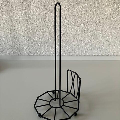 Basen er ottekantet og har en logo-indgravering fra Randvad. Metalstangen er høj og buet for at holde køkkenrullen effektivt på plads.
