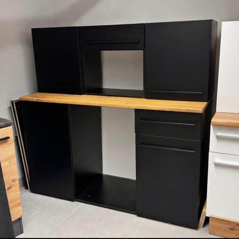 Helt nyt og ubrugt køkkenskab i moderne skandinavisk design. Hvid med sorte detaljer og træaccent. Perfekt til køkken eller spiseområde.