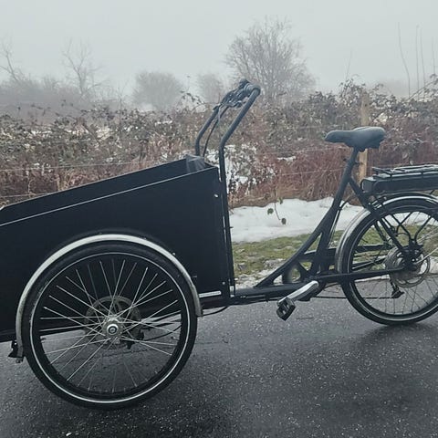 Jeg sælger min Christiania ladcykel med el, da vores familie flytter til udlandet og desværre ikke kan have den med.