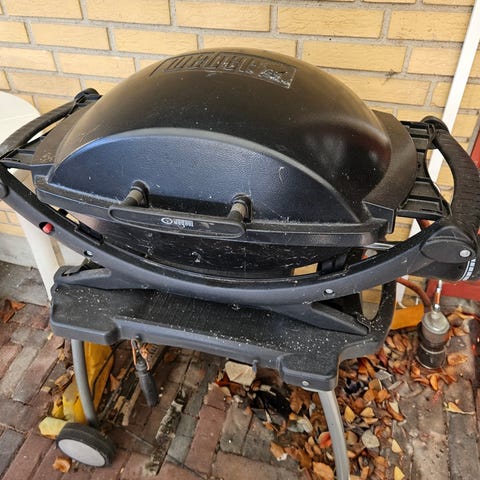 Weber Q gasgrill på stativ med hjul. Grillen har låg med indbygget termometer og sidehåndtag for nem håndtering. Den står på et stel med to hjul, som gør den let at flytte. Medfølgende grillovertræk ses på billederne. Velegnet til udendørs madlavning på terrasse eller altan.