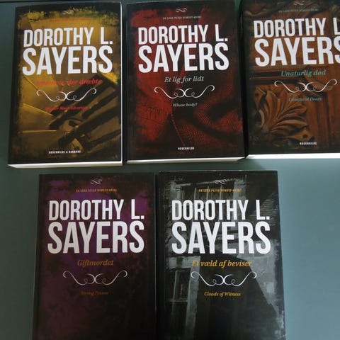 Dorothy L. Sayers krimibøger samling i dansk paperback. Samlingen omfatter flere titler i Peter Wimsey-serien, herunder blandt andet "Et væld af beviser", "De ni klokkeslag", "Peter Wimsey vækker politiet" og "Mysteriet i Bellonaklubben". Bøgerne er danske udgaver i lommebogsformat/paperback med trykt tekst på for- og bagside. Velegnet til læsere af klassiske krimier og samlere af Dorothy L. Sayers på dansk.