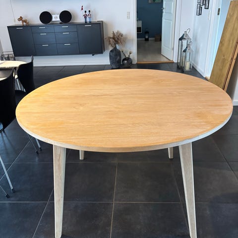 Spisebord i lyst massivt egetræ. En finer plade i eg medfølger, men der er plads til flere.