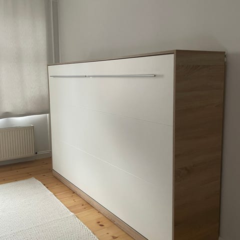 Fronten fremstår som et skab eller panel, når sengen er slået op. Konstruktionen har metalben og gasdæmpere, der hjælper med at folde sengen ned og op. Sengen er komplet med lamelbund og madras, som er som ny.