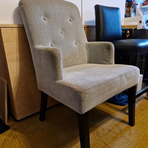 Polstret spisestuestol (Udsbjerg) i grå tekstil med armlæn og træben. Stolen har let buet ryg og fast sædepolstring, som giver støtte omkring ryg og sider. Egnet som ekstra stol i stue eller køkkenalrum. Neutralt, gråt stof og lyse træben passer ind i mange typer indretning.