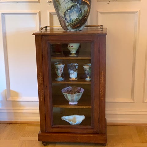Charmerende, gammel og møglækker glasvitrine. Med få brugsspor. Hylden er formentlig hjemmegjort, men den virker upåklageligt. -45x27,5x23,5. Kan sendes for kr. 47,