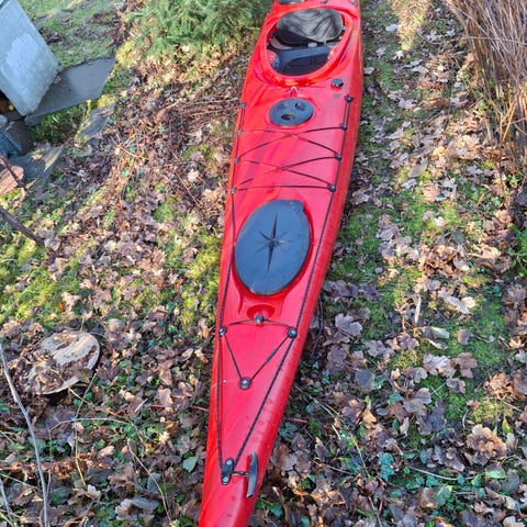 Havkajak med ror. Længde 510 cm. Ca 10 år gammel. Brugt til sejlads i Esrum sø og lidt Kattegat. Pagaj og skirt medfølger.