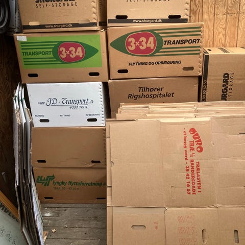 Pap flyttekasser i forskellige størrelser. Velegnet til opbevaring og flytning af indbo. Kasserne er sammenfoldelige og kan nemt stables. Flere kasser på billedet, primært i brun pap.