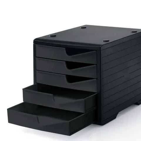 Skuffekontainer med hjul i hvid. Modellen har tre skuffer med sorte greb, hvor den øverste skuffe er udstyret med lås. Enheden står på hjul, så den er let at flytte rundt under eller ved siden af et skrivebord. Velegnet til opbevaring af kontorartikler, dokumenter og andre mindre genstande på kontor eller hjemmearbejdsplads.