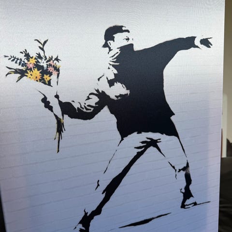 Banksy plakat med motiv af et barn i sort-hvid, der maler teksten "You’re never too young to dream big" med rød skrift på en væg. Billedet er monteret i en rektangulær ramme med lys kant og mørk inderkant. 100 x 70 cm (inkl. ramme)