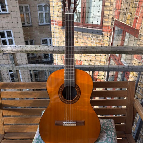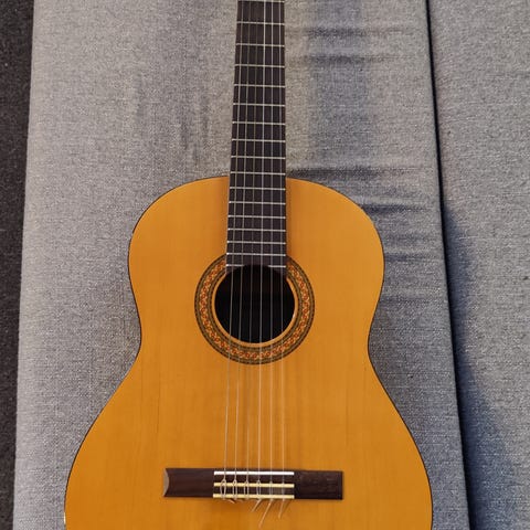 Yamaha C40BL akustisk guitar i fuld størrelse (4/4). Klassisk model med helt nye nylonstrenge og sort højglansfinish. Kroppen er udformet som en traditionel klassisk guitar med rund lydhul og indlagt roset. Halsen har gribebræt med båndmarkeringsprikker på siden. På billederne ses en clip-on tuner monteret på hovedet samt en polstret sort gigbag til opbevaring og transport. Velegnet til klassisk spil, akkompagnement og generel øvning på akustisk guitar.