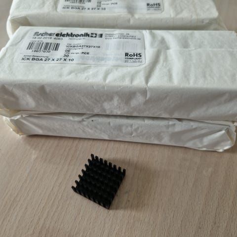 Køl med ribber i ren aluminium, 300 x 215 x 75 mm, hvoraf ribbernes højde udgør 60 mm. Kender ikke data angående grader per watt. En del 3 mm og 4mm huller med gevind er allerede lavet, se billeder. Kan sendes for købers regning.
