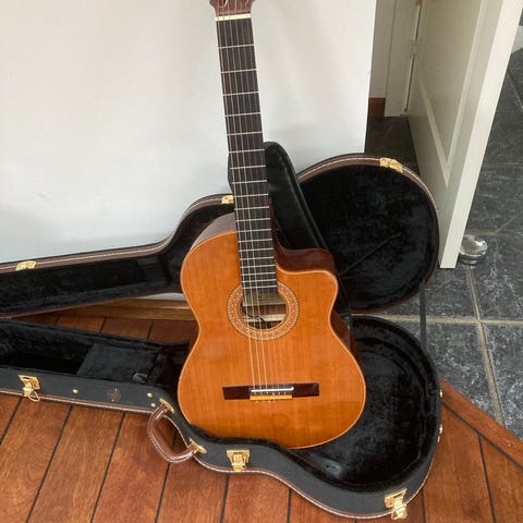 Jasmine by Takamine ES99C akustisk guitar i brun finish. Modellen er en western-type med udskæring (cutaway), som giver lettere adgang til de høje bånd. Kroppen er fuldstørrelse, og guitaren har stålstrenge. Halsen har gribebræt med markeringer langs hele længden. Leveres med blød bærepose som vist på billederne.