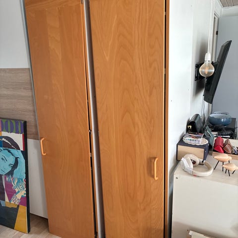 IKEA garderobeskab i lyst trælook. Skabet har sidehængslede låger og indvendig opdeling med flere hylder til opbevaring af tøj og andre genstande. Velegnet til soveværelse, børneværelse eller entré, hvor der er behov for ekstra skabsplads. Står som nyt skab super flot
