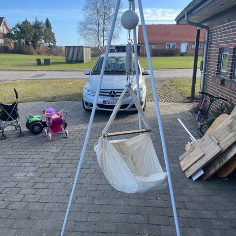 Slyngevugge inkl. stativ, motor, kapok madras fra moonboon, afstiver madras fra moonboon (stadig med prismærke på), lagen fra moonboon.
