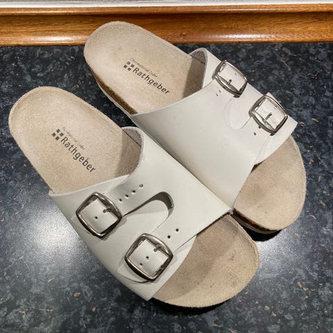 Hvide damesandaler med god svangstøtte. To remme til regulering. Materialet er læder og kork. Mærket er Rathgeber. Kun brugt en gang. Fremtræder derfor som nye. Sendes gerne.
