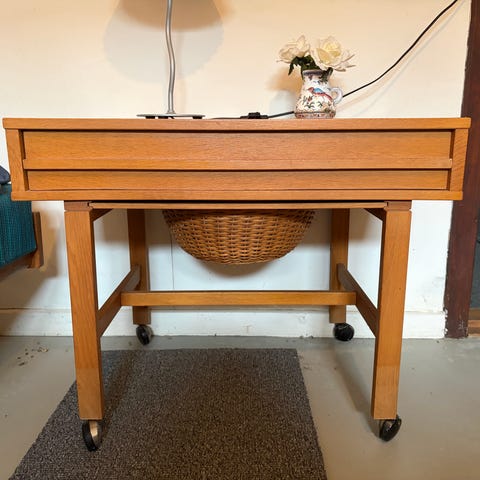 Hans J. Wegner AT-33 sybord i træ med skuffe og fletkurv