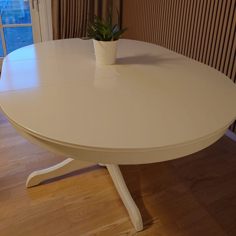Hvidt spisebord til 4 personer, med tillægsplader, så det nemt kan forlænges til 6 personer. Tillægspladen opbevares praktisk under bordpladen.