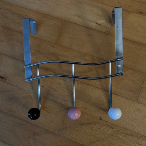 Knagerække i krom med 3 knopper i sort,lyserød og hvid. Er til en dør.