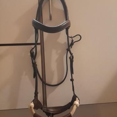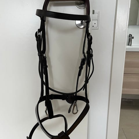 Dyon trense i brun læder. Anatomisk udformet nakkerem og næsebånd med blød polstring. Trensen har karakteristisk metalstykke ved næseryggen samt justerbare remme. Velegnet til ridning, hvor der ønskes en ergonomisk udformet trense til hest.