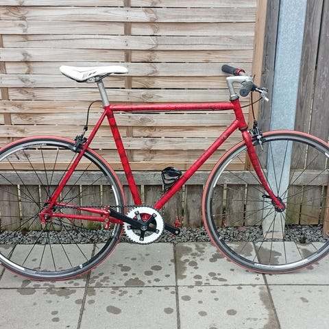 Sælger denne røde singlespeed herrecykel i størrelse 52.