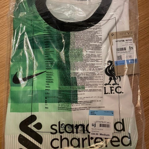 Liverpool FC fodboldtrøje til herre i størrelse S. Trøjen er overvejende hvid med grønne detaljer og sort halskant. Egnet til fodbold og anden sport eller som supportertrøje i hverdagen.