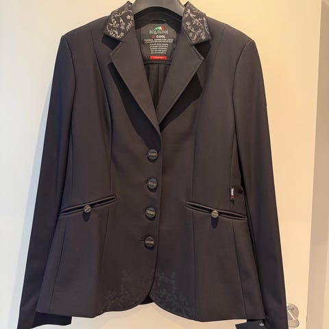 Equiline ridejakke i sort til dame. Jakken har klassisk snit med knaplukning foran og dekorative knapper ved ærmerne. Kraven og detaljen bagpå er udsmykket med sten, og jakken har slids bagtil for god bevægelsesfrihed i sadlen. Indersiden er glatforet for øget komfort under ridning eller stævner.
