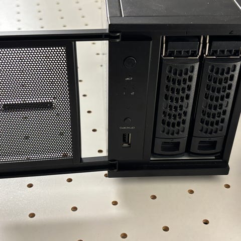 Netgear ReadyNAS Duo netværkslager i sort kabinet. Enheden er beregnet som netværkslager (NAS) til tilslutning i hjemmenetværk eller mindre kontormiljøer. Fronten har tænd/sluk-knap, statusindikatorer og USB-port til tilslutning af eksterne enheder. Kabinettet er ventileret i siderne for luftcirkulation. Velegnet til central lagring og deling af filer på netværket afhængigt af installerede harddiske og konfiguration.