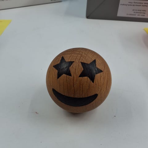 Objektet er en træbold med graverede smilende sundhedsbriller. Træoverfladen er glat.,Afhentes i:,Røde Kors Aabenraa (546),Bemærk at mail, chat og beskeder ikke besvares, og varen skal købes på knappen "Gå til varen"