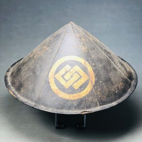 Japansk Jingasa fra Edo-perioden med Kawari Gyōyō Hanabishi våbenskjold, Original-tildeling, fra privat samling, 11,0 cm høj, 39,2 cm bred og dyb, vejer 700 g, i god stand med noget skimmel og overfladeslid. Klik på den blå "gå til varen" knap, for at købe eller byde på denne vare. Den samlede pris vil blive vist inden du afgiver dit bud.