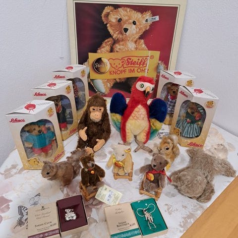 To miniatyr-teddybjørne af det tyske mærke Schuco, fremstillet i perioden 1950-1960. De er lavet af mohair. De har metalnåle, der gør arme og ben i stand til at bevæge sig. Kroppen er også overtrukket med metal og mohair. Hovederne kan forsigtigt drejes. Fra den brune bjørn går det nemmere end fra den lille gule bjørn. Det skal man altid gøre forsigtigt.