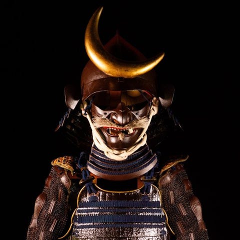 Originalt Yoroi fuld samurai- rustning fra Edo-perioden, Japan, lakerede jernplader med gildede detaljer, dimensioner 60 cm bred og 160 cm høj, med silke- og kobberkomponenter, i god stand og inklusive fod- og kasse; aldersrelateret skade og mulighed for tilføjede eller restaurerede dele. Klik på den blå "gå til varen" knap, for at købe eller byde på denne vare. Den samlede pris vil blive vist inden du afgiver dit bud.