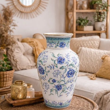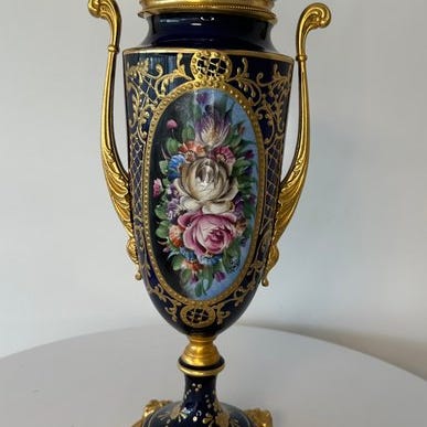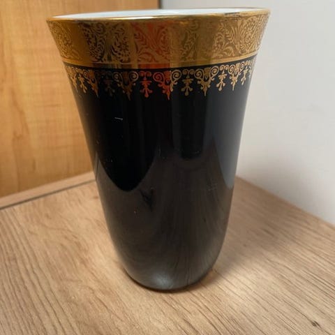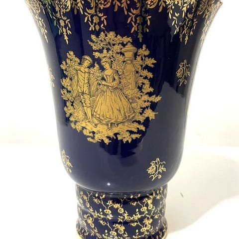 Stor vase Limoges Auteuil porcelæn håndmalet blå og guld 48 cm vintage