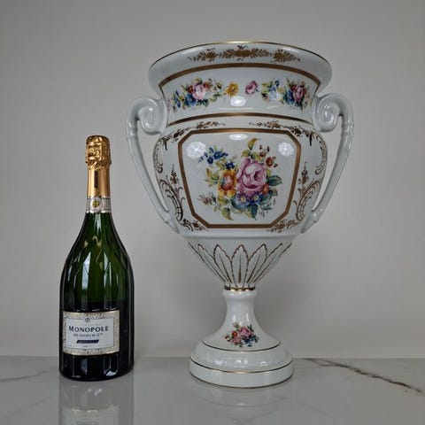 Limoges Auteuil porcelænsvaser håndmalet i blå og guld, 48 cm høj, 25 cm bred, 30 cm dyb, hvid, fremstillet i Frankrig, i god stand med små aldersmærker og pletter. Klik på den blå "gå til varen" knap, for at købe eller byde på denne vare. Den samlede pris vil blive vist inden du afgiver dit bud.