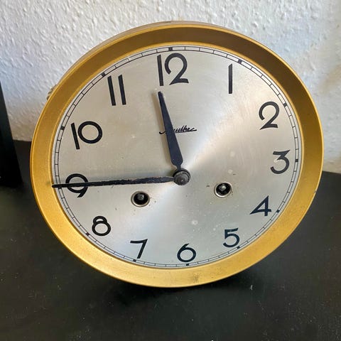 Tysk produceret træ- og messing mekanisk ur fra 1940–1950 med 8-dages gangværk og slag hver halve time på flere klokker, højde 20 cm, bredde 45 cm, dybde 15 cm, vægt 3 kg, med nøgle, i god brugt stand. Klik på den blå "gå til varen" knap, for at købe eller byde på denne vare. Den samlede pris vil blive vist inden du afgiver dit bud.