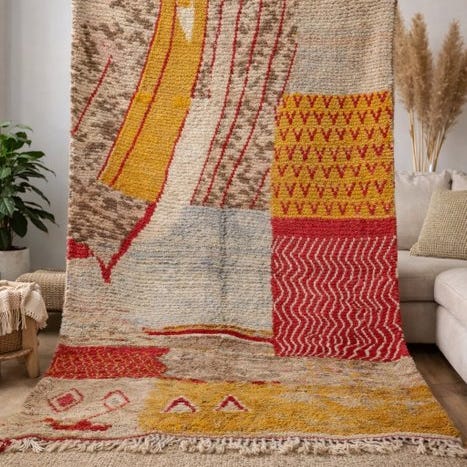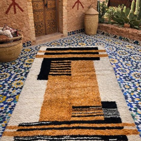 Lige ud fra hjertet af Atlasbjergene kommer dette smukke, håndlavede Berber-tæppe – et unikt kunstværk vævet af erfarne håndværkskvinder. Fremstillet af rig, naturlig uld på en robust bomuldsbase, udstråler dette tæppe ren autenticitet, varme og tidløse elegance.