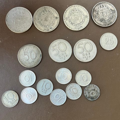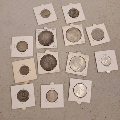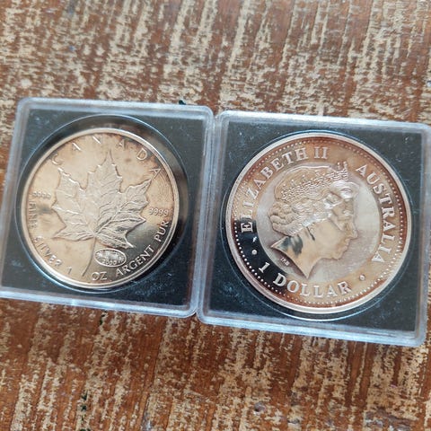 Samling af sølvfarvede mønter med forskellige historiske og symbolske motiver på for- og bagside. Mønterne ligger i runde plastkapsler. Motiverne omfatter blandt andet portrætter, frihedstemaer, våbenskjolde og geometriske symboler. Egnet til samlere af tematiske eller dekorative mønter. Antal, præcist materiale, årstal og oprindelsesland fremgår ikke tydeligt af billederne og bør kontrolleres ved interesse.1oz ren sølv 750kr pr stk