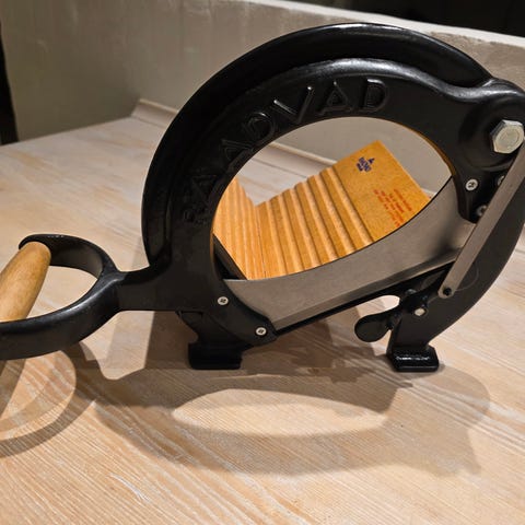 Dette er en cirka 100 år gammel danskproduceret Radvad manuel brødskærer.