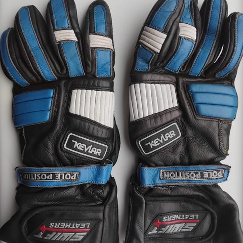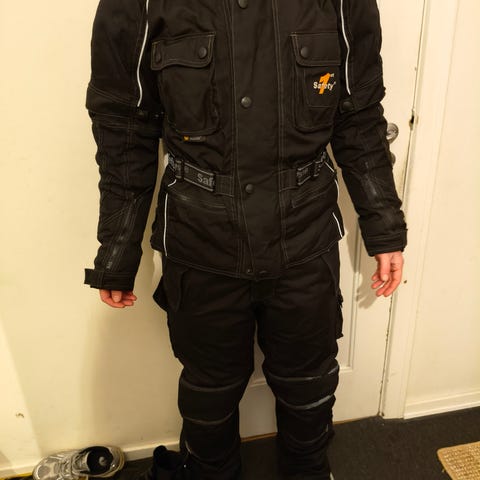 Motorcykel knæbeskyttere i sort PU læder med blød inderside. Beskytterne har justerbare stropper med elastiske bånd til fastgørelse omkring benet. Egnede til brug udenpå bukser ved motorcykelkørsel eller lignende aktiviteter, hvor ekstra benvarme er ønsket. Diverse pads til albue og skuldre samt et par lændeindlæg og en kørebrille. Alt dette er nyt og ubrugt. Herudover er en velholdt hjelmpose med. Sælges samlet