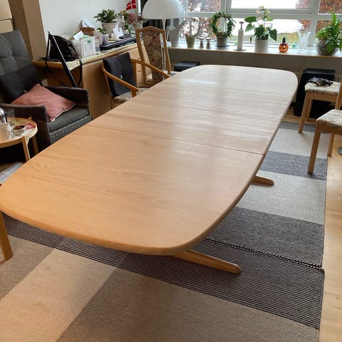 Pæn og velholdt massiv hvidolieret egetræs spisebord fra Skovby sælges for 9500,- incl. 4 tillægsplader. De 3 kan være i bordet. Det kan ialt sætte 6 plader i og plads til 20 pers.