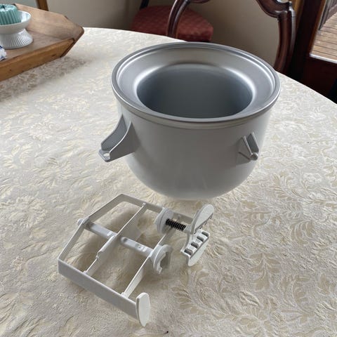 KitchenAid ismaskine skål og tilbehør. Sættet består af fryseskål, låg/indsats samt piskerist og adapterdel til montering på røremaskinen. Egnet til fremstilling af is og sorbet i en kompatibel KitchenAid røremaskine. Farve i lyse nuancer med metalindsats i skålen.