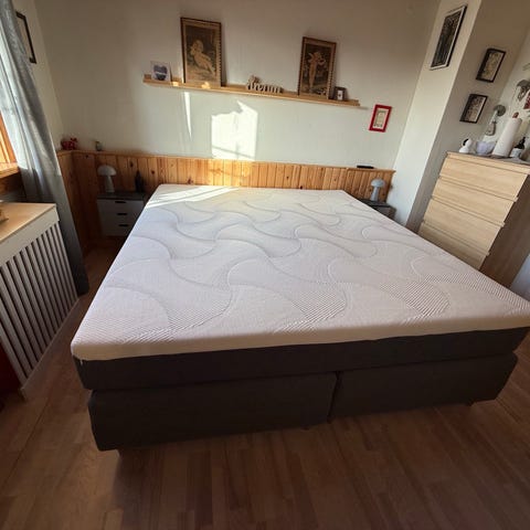 Underboks og gavl i grå antracit stof. Brilliant madras, fasthed mellem. Talalay topmadras kun et år gammel. Rullemadras bomuld.