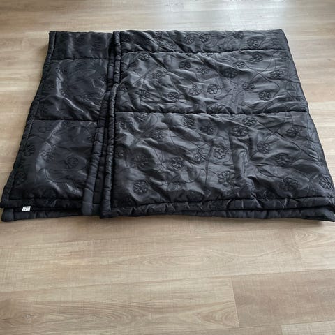 Sengetæppet er som nyt og i et smukt mønster. Faconsyet, så det passer til en boxmadras på 180x200m. Til tæppet hører 2 runde pyntepuder i samme stof.