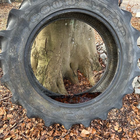 Pænt traktordæk, velegnet til sandkasse, gynge eller hvis man vil øve sig i at være stærk mand.