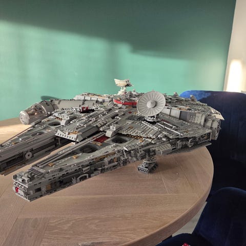 LEGO Star Wars Millennium Falcon byggesæt. Sættet forestiller rumskibet Millennium Falcon fra Star Wars-universet og består af et detaljeret modelskib med mange små byggeelementer. Der medfølger flere minifigurer fra Star Wars samt tilbehør, som kan placeres på og omkring modellen. Sættet egner sig til udstilling eller som samlerobjekt for LEGO og Star Wars interesserede.