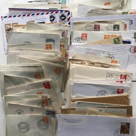Samling af gamle breve og dokumenter opbevaret i plastlommer. Materialet omfatter forskellige typer postale dokumenter og breve med frimærker og stempler. De er arrangeret i ark med huller til indbinding i mappe eller album. Egnede til samlere af historiske breve, filateli eller arkivmateriale.