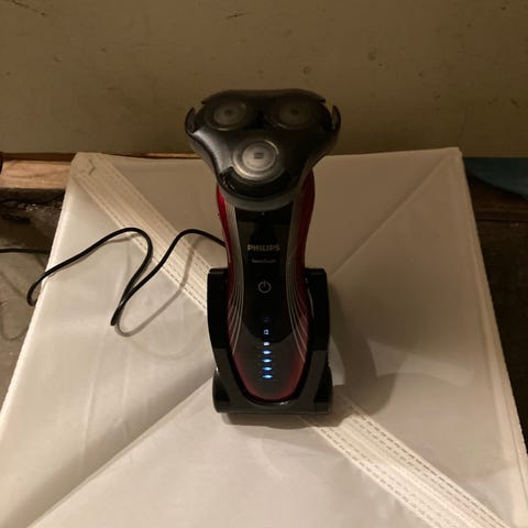 Philips elektrisk barbermaskine Wet & Dry i sort/hvid. Modellen har tre roterende skær i barberhovedet og et ergonomisk håndtag med gummigreb. Barbermaskinen kan anvendes til både tør- og vådbarbering. Der medfølger opladningskabel med stik til maskinen.