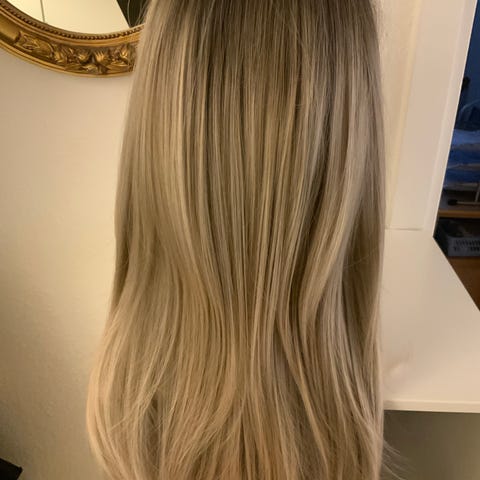 Den er 45 cm i blond farve med lidt lysere miks med naturlig look.