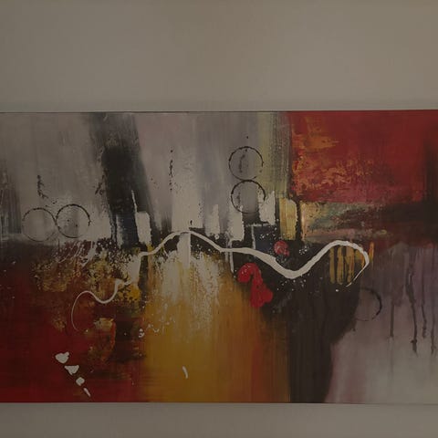 Abstrakt maleri på kvadratisk lærred i stærke flerfarvede nuancer, herunder rød, pink, gul, orange og sort. Motivet fremstår som et moderne, figurativt portræt kombineret med abstrakte former og struktur. Maleriet er opspændt på ramme og hænger direkte på væggen uden yderligere indramning. Egnet som vægudsmykning i stue, kontor eller andre opholdsrum, hvor der ønskes et farverigt og markant kunstnerisk udtryk.
